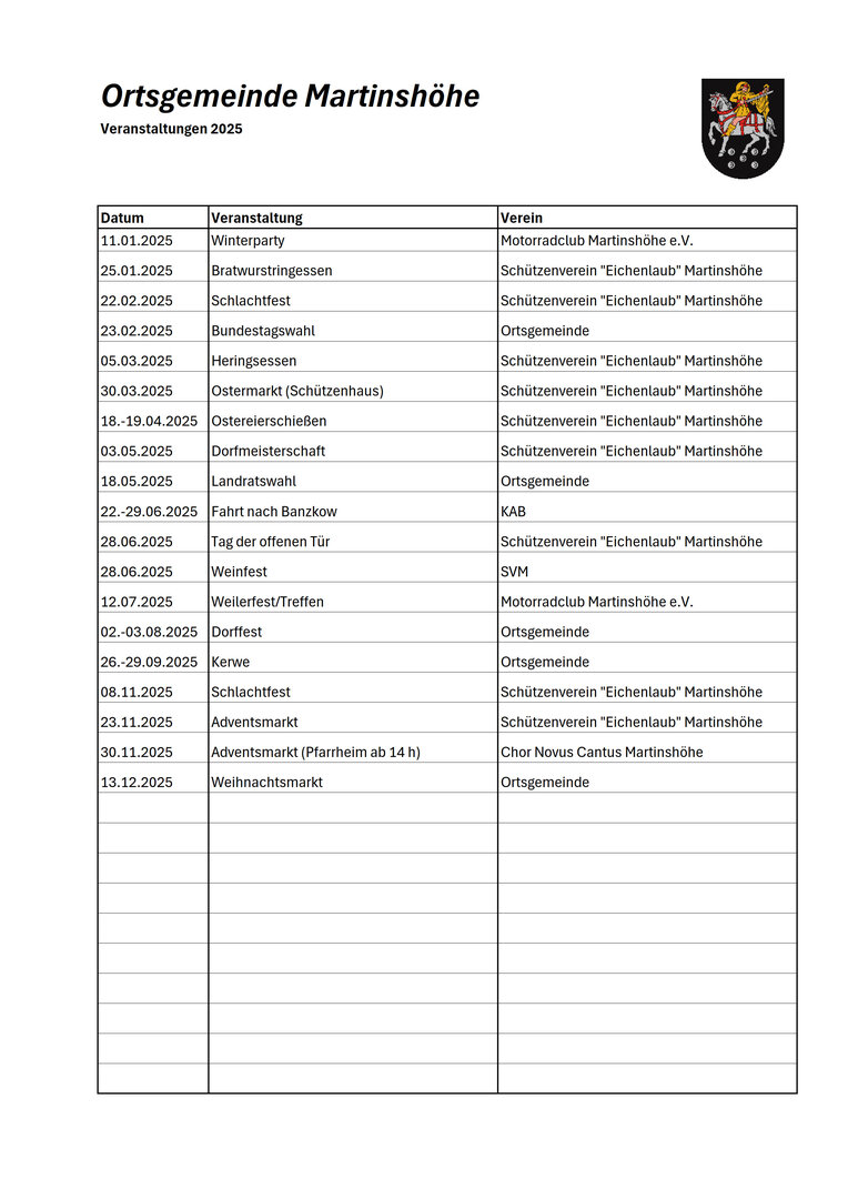 Zunächst gilt mein Dank den teilnehmenden Vereinen SV Martinshöhe, Schützenverein Eichenlaub, Heimat- und Kulturverein, Musikverein, dem Förderverein KiTa Martinshöhe und Frau Schiller als Privatperson für das Angebot auf dem Platz.