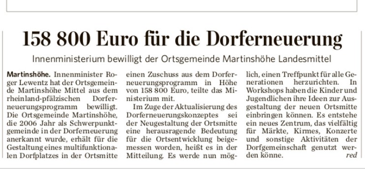 Innenminister Roger Lewentz hat der Ortsgemeinde Martinshöhe Mittel aus dem rheinland-pfälzischen Dorferneuerungsprogramm bewilligt. Die Ortsgemeinde Martinshöhe, die 2006 Jahr als Schwerpunktgemeinde in der Dorferneuerung anerkannt wurde, erhält für die Gestaltung eines multifunktionalen Dorfplatzes in der Ortsmitte einen Zuschuss aus dem Dorferneuerungsprogramm in Höhe von 158.800 Euro. Im Zuge der Aktualisierung des Dorferneuerungskonzeptes wurde der Neugestaltung der Ortsmitte eine herausragende Bedeutung für die Ortsentwicklung beigemessen. Es wird nun möglich, einen Treffpunkt für alle Generationen herzurichten. In Workshops haben die Kinder und Jugendlichen ihre Ideen zur Ausgestaltung der neuen Ortsmitte einbringen können.