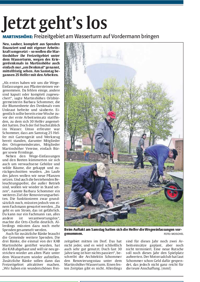 Außerdem soll evtl. an den Wegeeinfassungen ab dem Kriegsgräberdenkmal (hinter den Bänken der KAB) weitergemacht werden, teilweise Pflanzen gesetzt werden, an der Beton“Bühne“ Pflanzen rausgemacht werden, Mutterboden eingefüllt und vielleicht schon neu gepflanzt werden, usw., für eine Sitzbank könnten am Spielplatz die Fundamente gegossen werden.