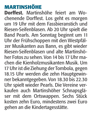 Das traditionelle Dorffest in Martinshöhe findet -wie jedes Jahr- am 1. Augustwochenende in der Freizeitanlage am Wasserturm statt. Start ist samstags um 18h, um 19h ist der Fassbieranstich. Gefeiert wird bis in die Nacht. Am Sonntag geht es ab 11h weiter- die Vereine sorgen an den beiden Tagen für das leibliche Wohl. Ein unterhaltsames Programm verspricht vergnügte Stunden in unserer schönen Freizeitanlage .