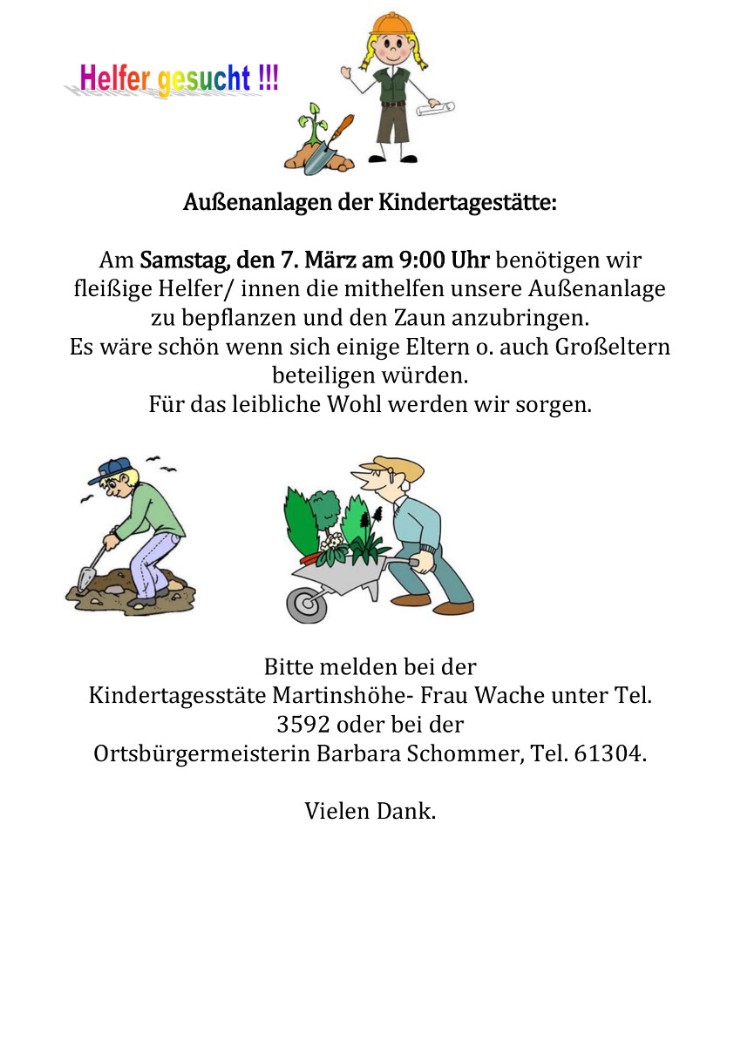 Am 07.03.15 fand der Arbeitseinsatz zur Neubepflanzung der Außenanlagen und zum Einbau des Zauns statt. Bei wunderbarem Wetter trafen sind um 9 h zahlreiche Eltern, Großeltern und auch Ratsmitglieder um die Pflanzen, die von der Baumschule Ritthaler aus Hütschenhausen geliefert wurden, unter fachmännischer Aufsicht von Hr. Ritthaler einzupflanzen.