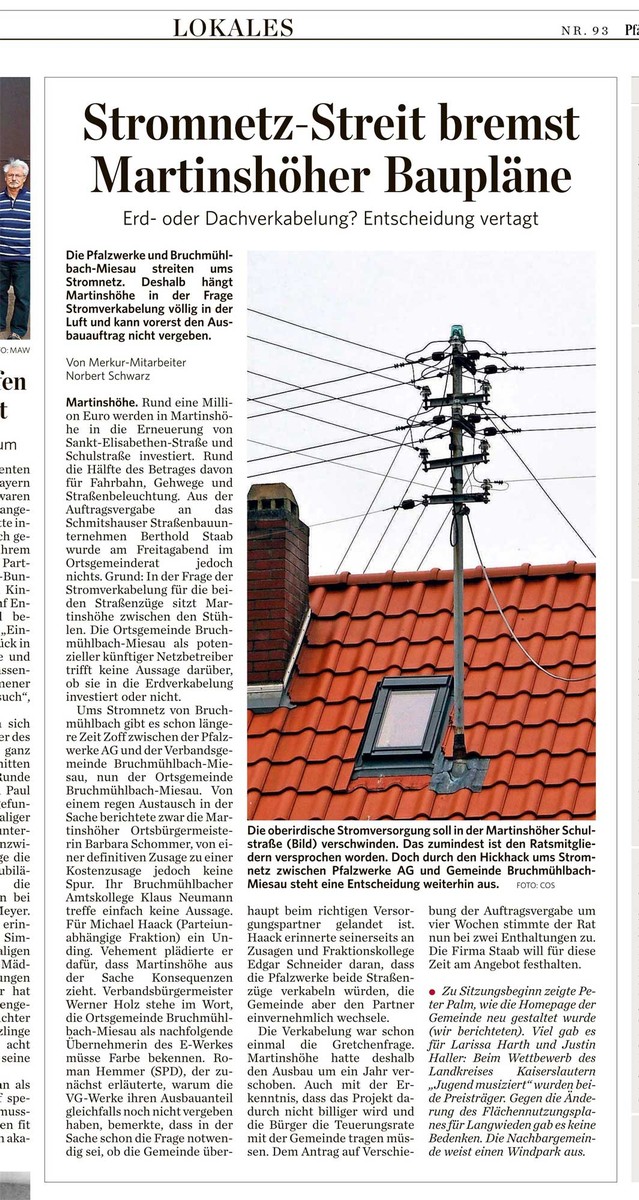 Bericht aus der Rheinpfalz (Ausgabe KL) vom 22.04.2013 über die Sitzung des Ortsgemeinderates am 19.04.2013