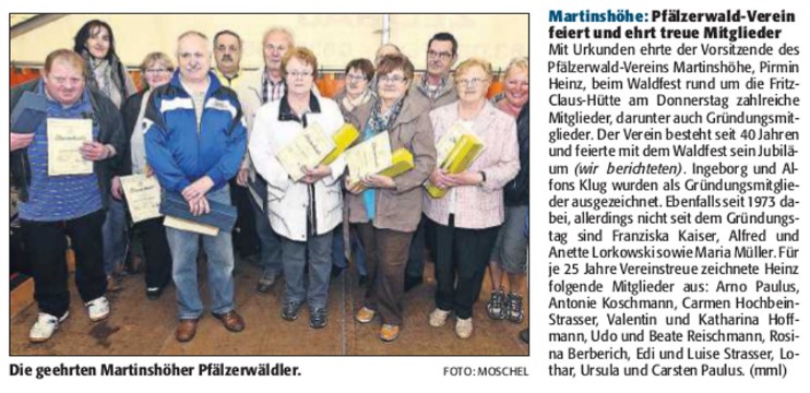 Trotz Regenschauer an Christi Himmelfahrt konnte der Pfälzerwald Verein Martinshöhe zu seinem 40-jährigen Jubiläum und Waldfest 2013 ca. 1000 Besucher begrüßen. Das Fest begann mit einem Gottesdienst mit Gesang des Kirchenchores. Anschließend spielte der Musikverein Martinshöhe zum Frühschoppen. Danach gab es Grußworte des 1. Vorsitzenden Pirmin Heinz, der Ortsbürgermeisterin Barbara Schommer, des Verbandsbürgermeister Werner Holz und der Bezirksobfrau Sigrid Odenwald sowie Ehrungen für 40-jährige und 25-jährige Mitgliedschaft. Die Kindertagesstätte Martinshöhe unterhielt die Gäste mit Tänzen und Liedern, die extra für das Jubiläum einstudiert wurden. Zum Ende des Programms unterhielt uns noch eine Akkordeongruppe aus Ramstein-Miesenbach. Auch wurden an diesem Tag verschiedene Holzsägearbeiten von Herrn Jan Klein vor Ort präsentiert.