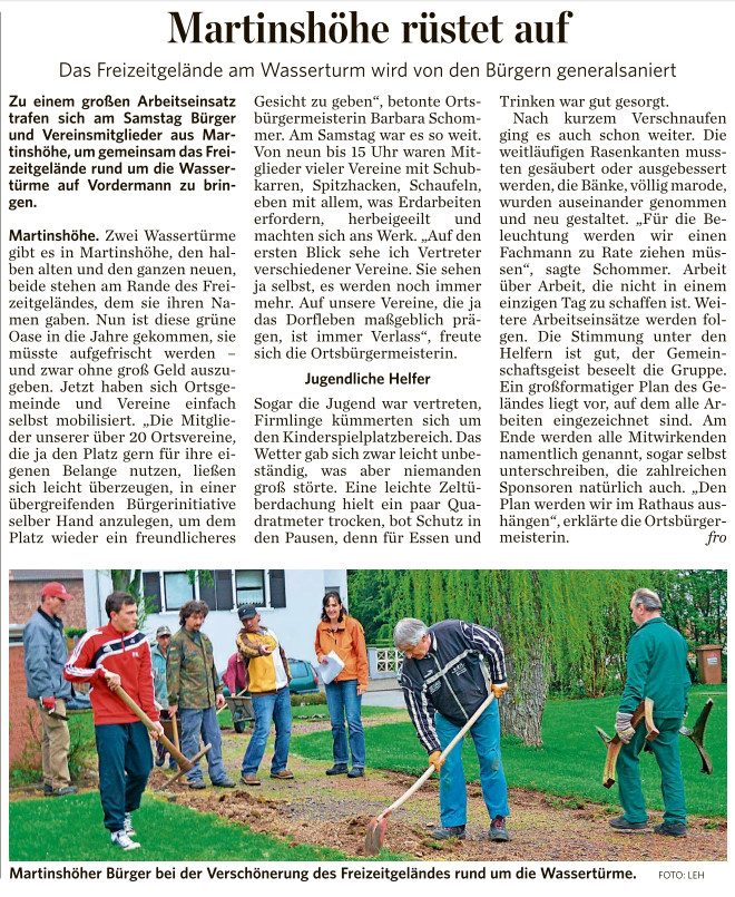 Innenminister Roger Lewentz hat der Ortsgemeinde Martinshöhe Mittel aus dem rheinland-pfälzischen Dorferneuerungsprogramm bewilligt. Die Ortsgemeinde Martinshöhe, die 2006 Jahr als Schwerpunktgemeinde in der Dorferneuerung anerkannt wurde, erhält für die Gestaltung eines multifunktionalen Dorfplatzes in der Ortsmitte einen Zuschuss aus dem Dorferneuerungsprogramm in Höhe von 158.800 Euro. Im Zuge der Aktualisierung des Dorferneuerungskonzeptes wurde der Neugestaltung der Ortsmitte eine herausragende Bedeutung für die Ortsentwicklung beigemessen. Es wird nun möglich, einen Treffpunkt für alle Generationen herzurichten. In Workshops haben die Kinder und Jugendlichen ihre Ideen zur Ausgestaltung der neuen Ortsmitte einbringen können.