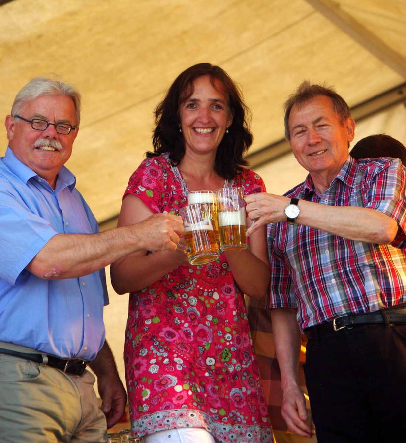 Trotz tatkräftiger Unterstützung der beiden Beigeordneten der Verbandsgemeinde Bernhard Hirsch und Fritz Hellriegel, gelang es der Ortsbürgermeisterin erst im 2. Anlauf, den Zapfhahn einzuschlagen und die ersten Gläser füllen zu können.