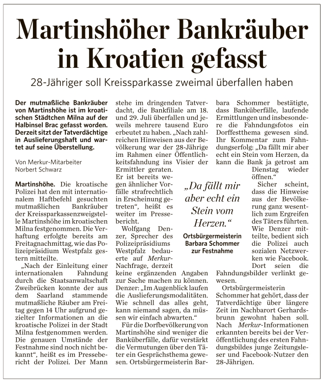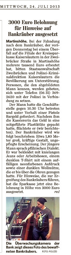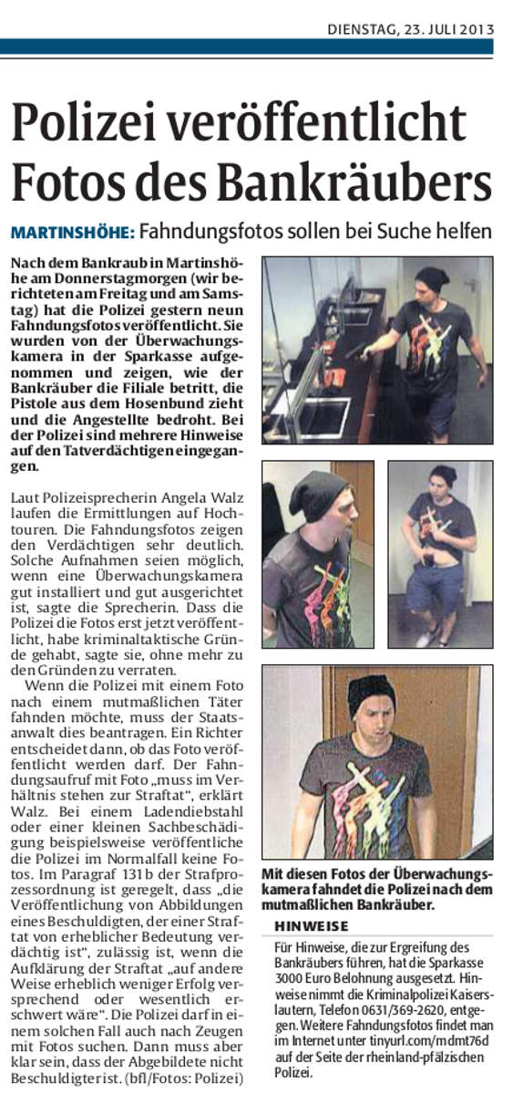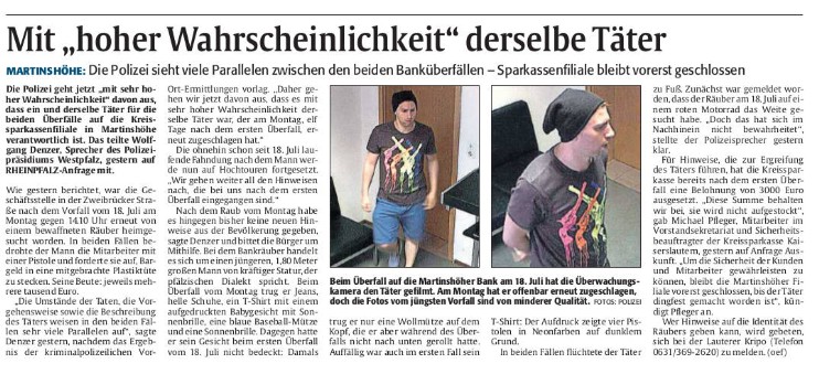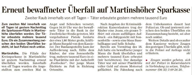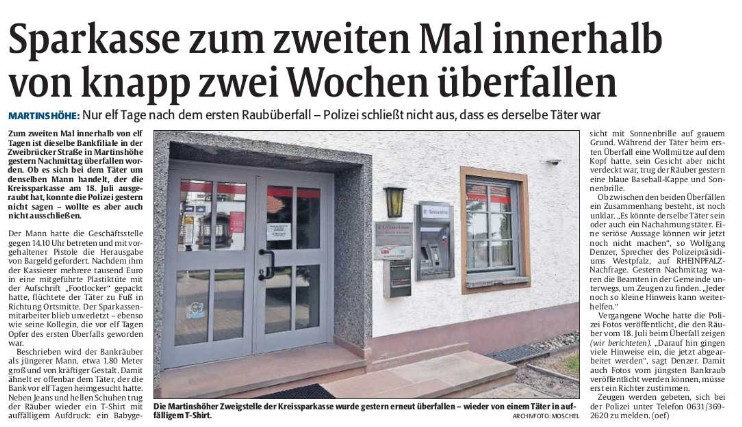 Nachtrag Bericht Rheinpfalz zum Banküberfall KSK Filiale Martinshöhe