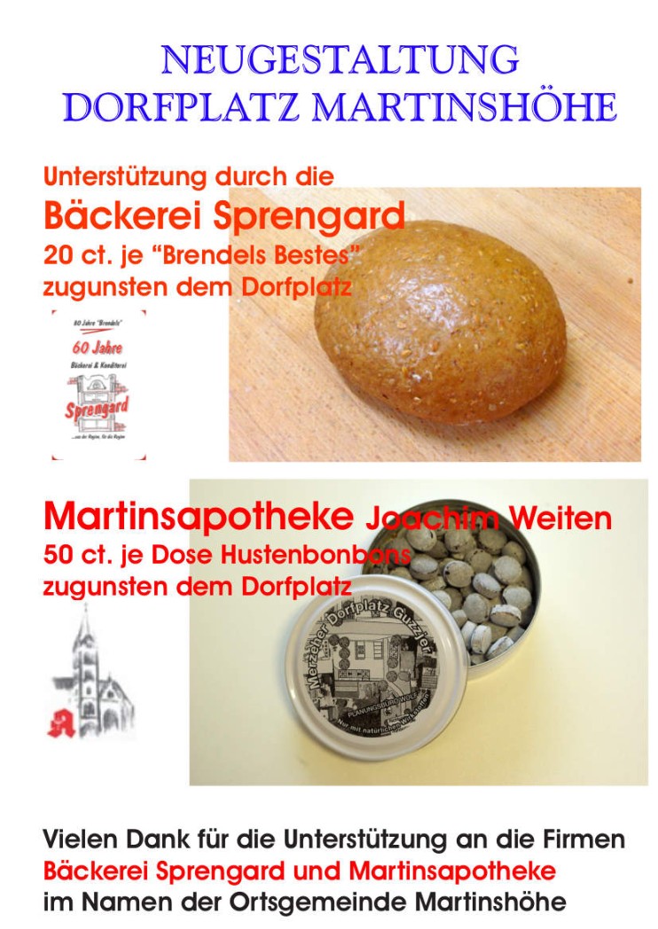 Sowohl die Bäckerei Sprengard als auch die Martins-Apotheke Joachim Weiten aus Martinshöhe unterstützen die Neugestaltung des Dorfplatzes Martinshöhe mit dem Verkauf von „Brendels Bestem“ - Brot und „Märzeher Dorfplatz Guzzjer“ - Hustenbonbons.