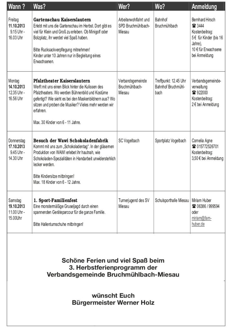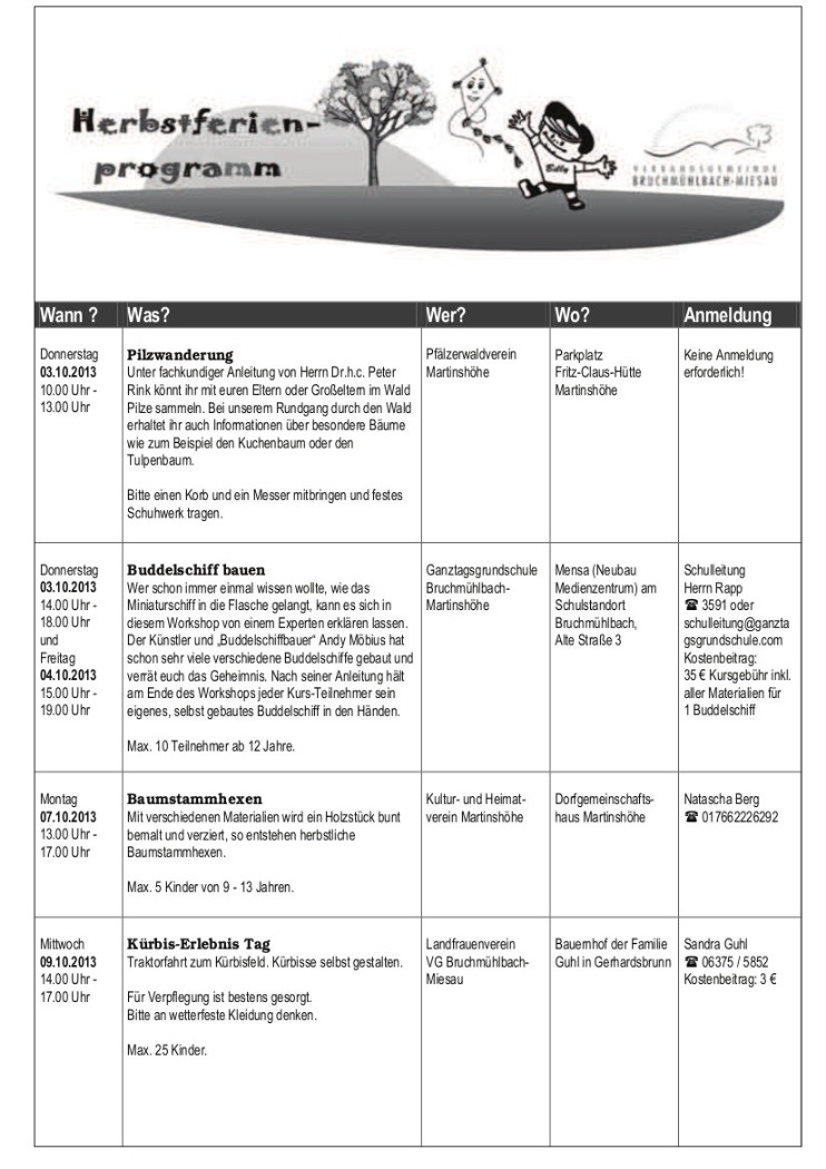 Das Ferienprogramm der Verbandsgemeinde Bruchmühlbach-Miesau für die Herbstferien 2013: