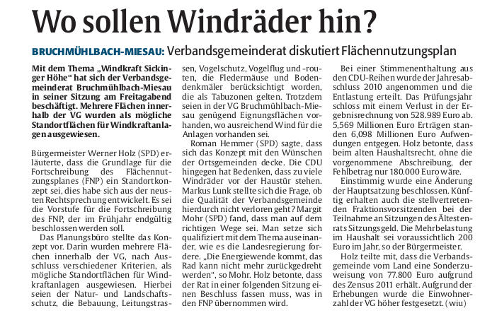 Rheinpfalz - Berichte aus Verbandsgemeinderatssitzung zum Thema Windenergie