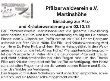 Einladung zur Pilz- und Kräuterwanderung des Pfälzerwaldverein e.V. Martinshöhe