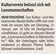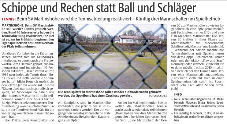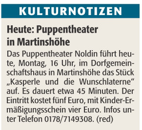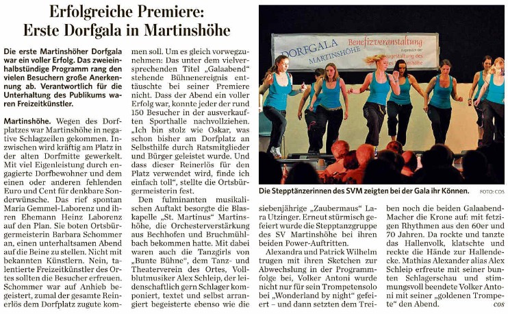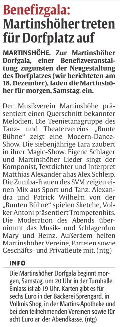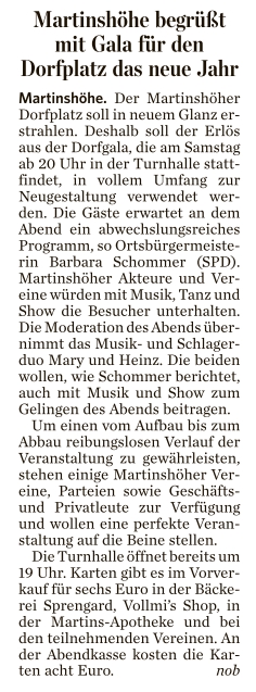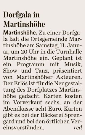 Stimmung und gute Laune verspricht die Martinshöher Dorfgala am 11. Januar 2014 in der Turnhalle Martinshöhe. Der Reinerlös dieser Veranstaltung wird in vollem Umfang zur Neugestaltung des Dorfplatzes verwendet. Keiner der Mitwirkenden erhält eine Gage.