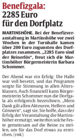 Hiermit ergeht eine herzliche Einladung vor allem an alle Martinshöher Bürgerinnen und Bürger, diese Veranstaltung zu besuchen und damit diese einmalige Initiative zugunsten des Dorfplatzes zu unterstützen.