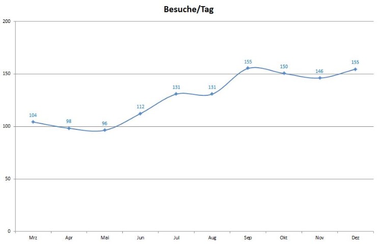 als unser Arbeitskreis im Januar 2013 seine Arbeit aufgenommen hat, lagen die Besucherzahlen der bis dahin nahezu brach liegenden Webseite bei unter 30 Besuchen pro Tag. Die neu erstellte Seite wurde am 13.03.2013 um 22:00 h veröffentlicht. Gleich nach Veröffentlichung gingen die Besuche auf über 100 pro Tag hoch, was sich in den Folgemonaten zunächst bestätigte und dann sogar kontinuierlich anstieg. Seitdem haben sich die Besuche bei mittlerweile ca. 150 Besuchen pro Tag stabilisiert, wie Sie untenstehender Grafik entnehmen können.