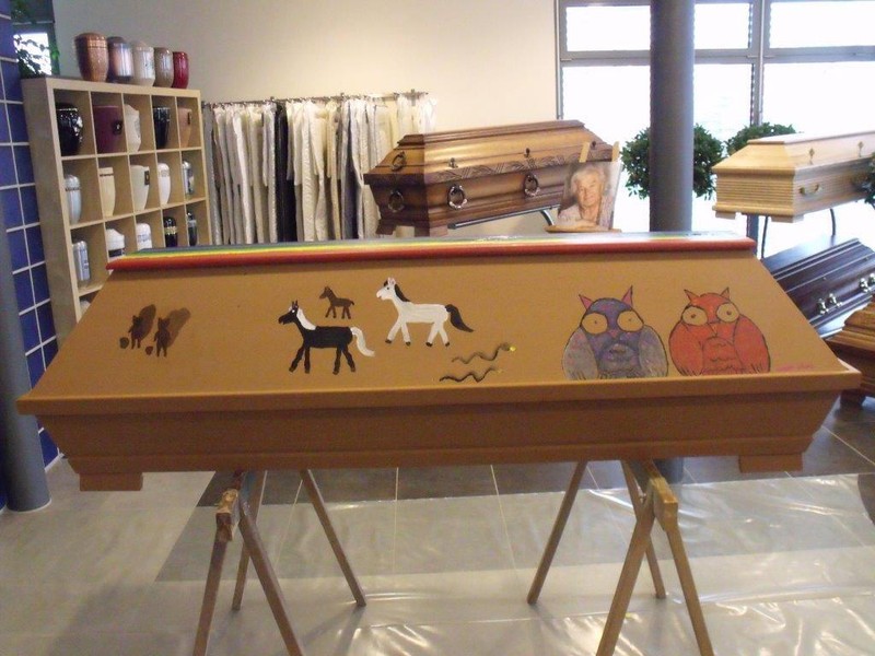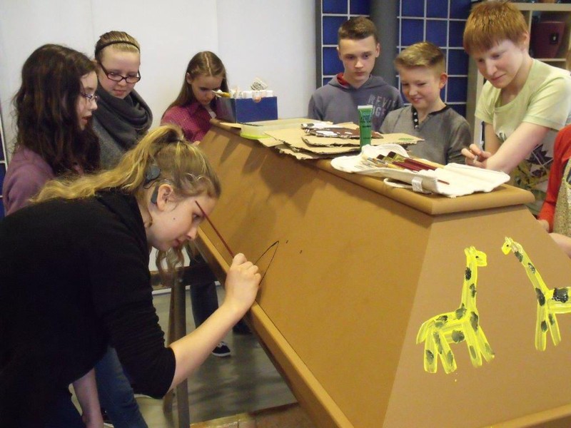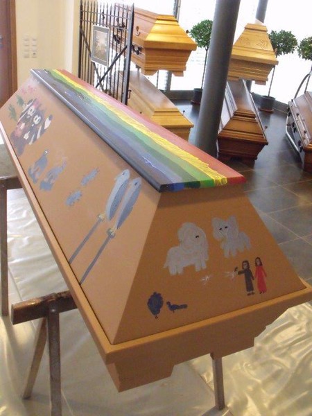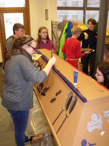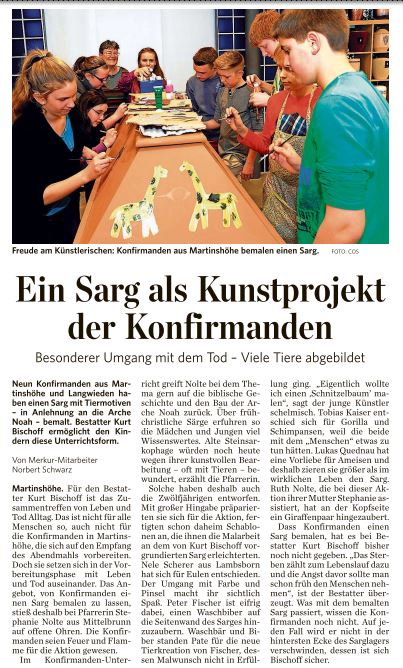 Thema war „Arche bzw. Arche des Noah“. Die Konfirmanden waren recht gut „dabei“. Leider war die Zeit zu kurz angesetzt, beim ersten Mal verständlich. Norbert Schwarz vom Pfälzischen Merkur war auch anwesend, um einen Bericht über das interessante und ungewöhnliche Projekt zu schreiben. Der Sarg bleibt bis auf weitere Anweisung der Konfirmanden bzw. Frau Nolte in der Ausstellung zwischen den herkömmlichen Särgen.