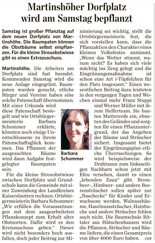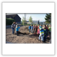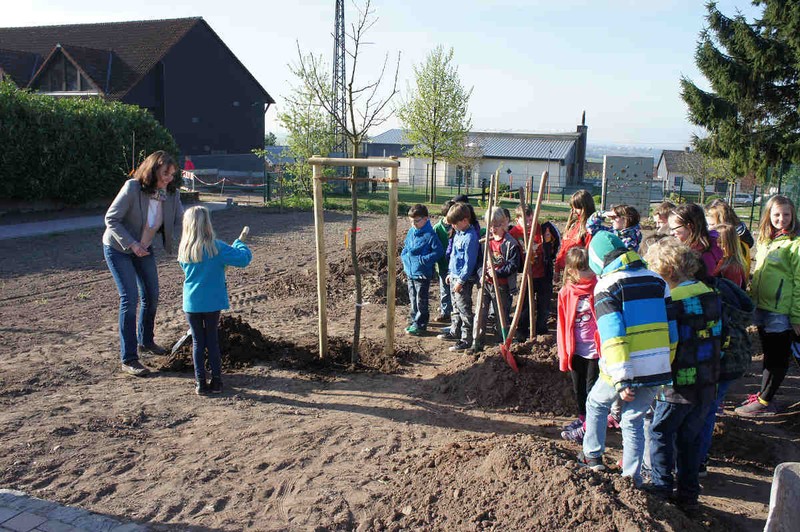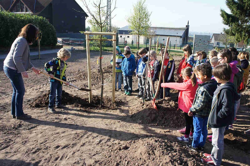 Im Rahmen des neugestalteten Martinshöher Dorfplatzes wurde auf dem Gelände zwischen Dorfplatz und Grundschule eine Streuobstwiese mit Obstbäumen und Beerensträuchern angelegt. Für die jeweiligen Bäume war die Bevölkerung aufgerufen, Baumpatenschaften zu übernehmen. Als die Ortsbürgermeisterin Frau Schommer an unserer Schule anfragte, ob auch Schulkinder des Schulstandortes Martinshöhe interessiert wären, eine derartige Patenschaft zu übernehmen, mussten wir nicht lange überlegen. Natürlich erklärten wir uns sofort bereit, diese tolle Aktion zu unterstützen. Am letzten Schultag vor den Osterferien - Donnerstag, 10.04.2014 - war es soweit: Unser Apfelbaum mit dem botanischen Namen „MALUS Kardinal Bea“ wurde von den Klassen 1c und 3c, in Begleitung der Lehrerin Kathrin Kohl, Schulleiter Andreas Rapp und Pfarrerin Stephanie Nolte unter Anleitung von Ortsbürgermeisterin Barbara Schommer eingepflanzt und gut angegossen. Somit war unsere Baumpatenschaft besiegelt. Nun können wir das Anwachsen des Baumes, sein Wachstum und seine Veränderung im Jahreslauf beobachten und natürlich auch im Unterricht thematisieren. Selbstverständlich ist auch eine entsprechende Pflege nötig. Wir hoffen, dass unser Apfelbaum nun schnell wächst, gut gedeiht und bald süßsauer schmeckende, saftige Früchte trägt, die wir dann gemeinsam ernten werden.