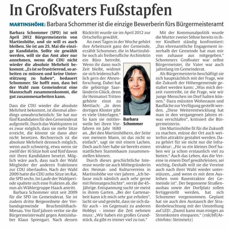 In der Zeit zwischen dem 21. - 27.04.14 übernimmt der 1. Beigeordnete Stephan Manuel die Vertretung. Er ist unter Tel. 0176 / 64 65 21 25 erreichbar.