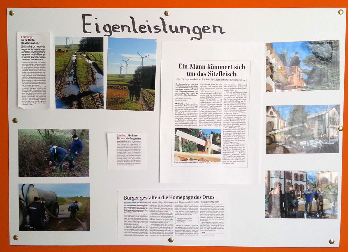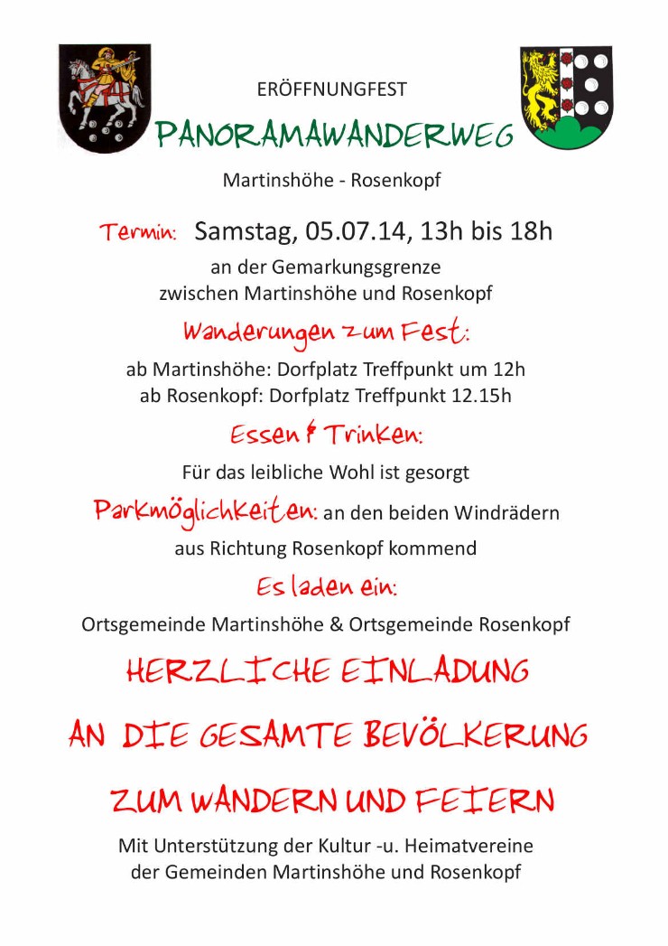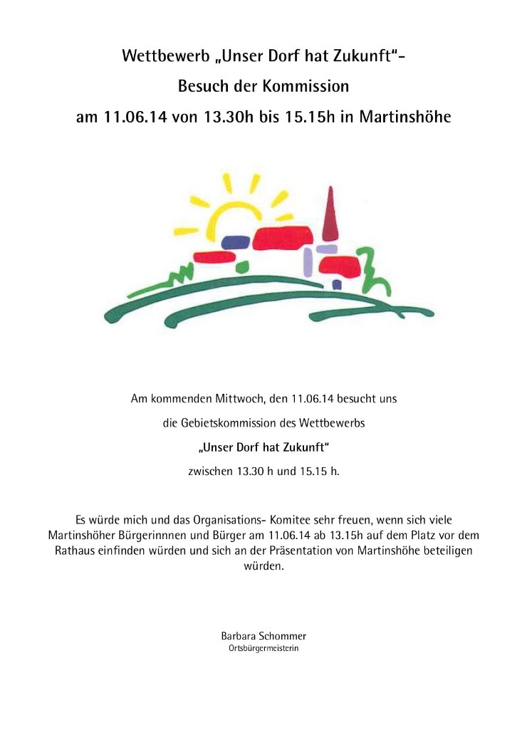 Am kommenden Freitag, den 30.05.14 treffen wir uns um 19h im Rathaus zur Vorbereitung des Besuches der Kommission „Unser Dorf hat Zukunft“ am 11.06.14. Die Kommission wird am 11.06. von 13.30h - 15.15h in Martinshöhe sein. Es würde mich sehr freuen, wenn sich Martinshöher Bürgerinnen und Bürger auch am 11.06.14 an der Präsentation von Martinshöhe beteiligen würden.