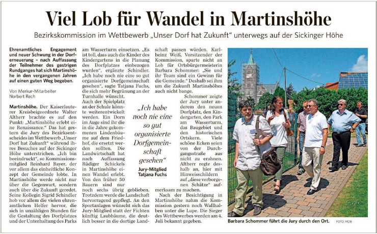 Am kommenden Freitag, den 06.06.14 treffen wir uns um 19h im Rathaus zur Vorbereitung des Besuches der Kommission „Unser Dorf hat Zukunft“ am 11.06.14. Die Kommission wird am 11.06. von 13.30 - 15.15h in Martinshöhe sein. Es würde ich sehr freuen, wenn sich Martinshöher Bürgerinnen und Bürger auch am 11.06.14 an der Präsentation von Martinshöhe beteiligen würden.