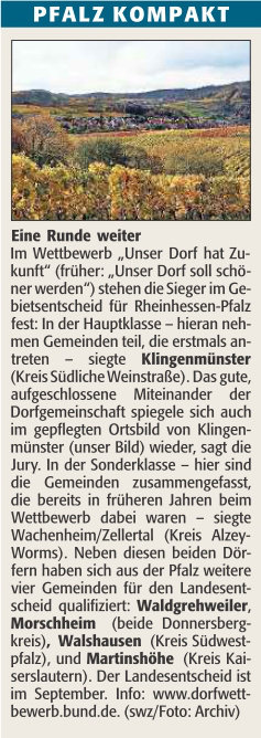 Wir haben den 5. Platz in der Sonderklasse erreicht und uns somit für den Landeswettbewerb qualifiziert! Aus 220 beteiligten Gemeinden wurden 4 Gemeinden in der Hauptklasse und 5 in der Sonderklasse prämiert. Das ist ein herausragendes Ergebnis, auf das wir alle stolz sein können. Die ressemitteilung der Präsidentin der ADD- Dagmar Barzen von heute Morgen 10h ist unten verlinkt.