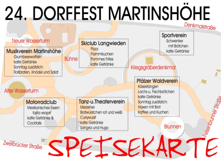 Das traditionelle Dorffest in Martinshöhe findet -wie jedes Jahr- am 1. Augustwochenende in der Freizeitanlage am Wasserturm statt. Start ist samstags um 18h, um 19h ist der Fassbieranstich. Gefeiert wird bis in die Nacht. Am Sonntag geht es ab 11h weiter- die Vereine sorgen an den beiden Tagen für das leibliche Wohl. Ein unterhaltsames Programm verspricht vergnügte Stunden in unserer schönen Freizeitanlage .