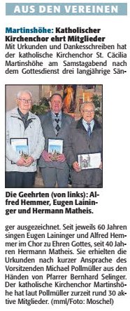 Der 1. Vorsitzende der AWO Bruchmühlbach-Miesau, Bernhard Hirsch, stellte den Seniorinnen und Senioren das Projekt „Bürgerbus“ vor, das er ins Leben gerufen hat und das alle Senioren aus der Gemeinde in Anspruch nehmen können. Nachdem Kaffee, Kuchen und belegte Brötchen serviert worden waren, folgte die Musikdarbietung der Kreismusikschule Kaiserslautern unter der Leitung von Elena Sehy. Lara Pfaff und Rebekka Hemmer spielten am Keyboard mehrere Musikstücke. Auch ihnen herzlichen Dank. Geehrt wurden, wie seit Jahren üblich, die älteste anwesende Einwohnerin Frau Anna Sehy (96 Jahre) mit einem Blumenstrauß, der uns vom Blumengeschäft „Flowershop“ aus Martinshöhe kostenlos zur Verfügung gestellt wurde. Der älteste anwesende Mann aus Martinshöhe, Herr Hans Naßhan, ist 92 Jahre alt und bekam eine Flasche guten Schnaps.
