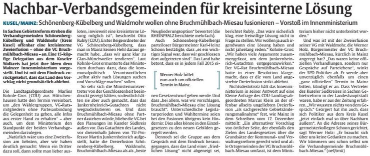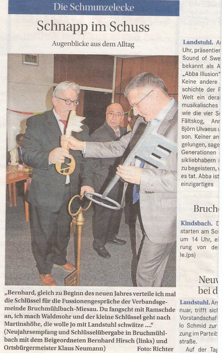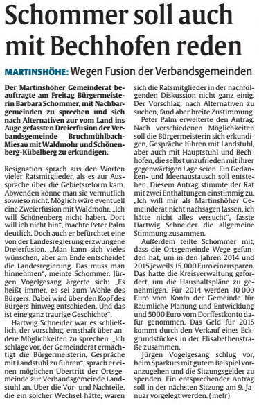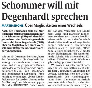 Neben diesem Projekt wird wohl die Entscheidung zur unserer gemeindlichen Zukunft in der Kommunal- u. Gebietsreform fallen. Neben den von der Landesregierung geplanten 3er Fusion mit Schönenberg-Kübelberg und Waldmohr sowie Bruchmühlbach-Miesau, sind noch anderer Varianten im Gespräch und wir hoffen, daß für unsere Gemeinde eine tragfähige Lösung herauskommt.