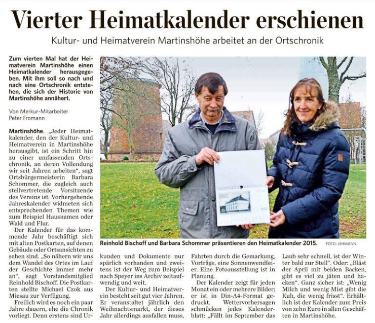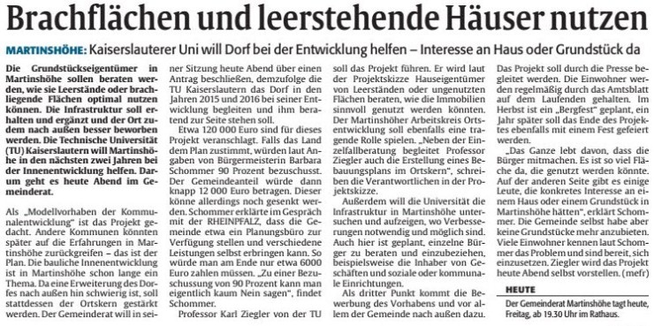 Im nächsten Jahr wollen wir ein Projekt beginnen, das uns helfen soll, uns für die Zukunft zu rüsten. In der nächsten Gemeinderatsitzung am 09.01.15 wird das Projekt „Kommune der Zukunft: Martinshöhe - Innen vor Außen in der Praxis einer Ortsgemeinde“ durch Prof. Dr. Ziegler von der TU Kaiserslautern vorgestellt. Das Projekt soll über 2 Jahre gehen und betrifft die Themen: baulichen Innenentwicklung und der Nutzung von Brachflächen und Leerstände; Stabilisierung und Ergänzung des örtlichen Infrastrukturangebotes; die vorhandene und gewonnene Attraktivität des Ortes soll offensiv transportiert werden, um die Eigen- und Fremdwahrnehmung von Martinshöhe zu verbessern und für das "Leben auf dem Dorf" zu werben.