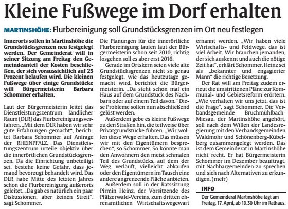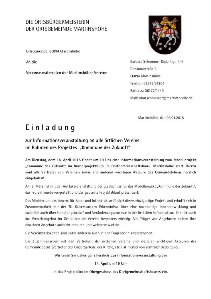 Die Fragebögen, die im Rahmen des Modellprojekts "Kommune der Zukunft" Klarheit über die Einschätzung der Martinshöher Bevölkerung zur baulichen Entwicklung, unserer Infrastruktur und der Wahrnehmung unserer Gemeinde geben sollen, werden in den kommenden Wochen durch die Mitglieder des Arbeitskreises „Initiative Zukunft für Martinshöhe“ und den Ortsgemeinderat ausgeteilt.