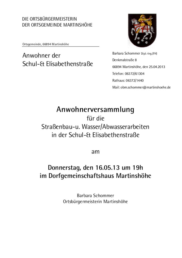 Am Donnerstag, den 16.05.13 hat im Dorfgemeinschaftshaus Martinshöhe eine Anwohnerversammlung für die Durchführung der Straßenbauarbeiten stattgefunden.
