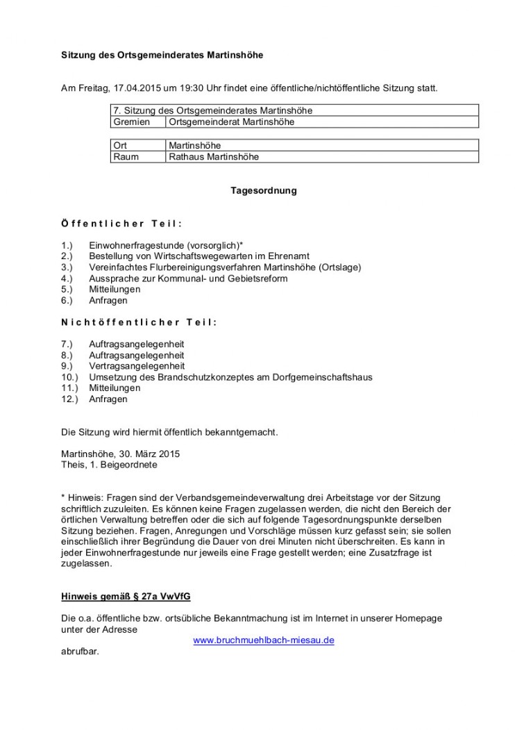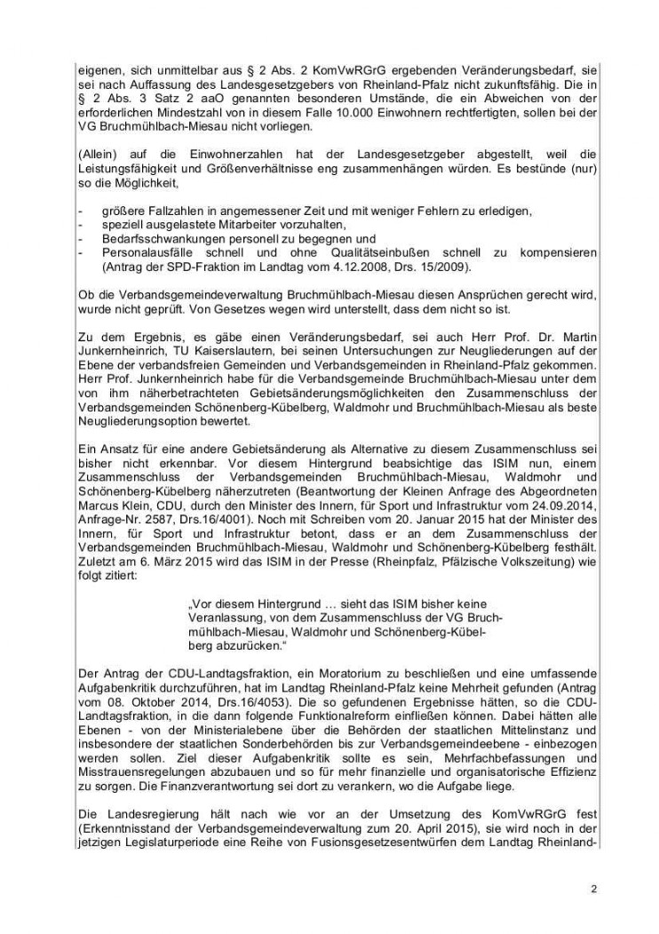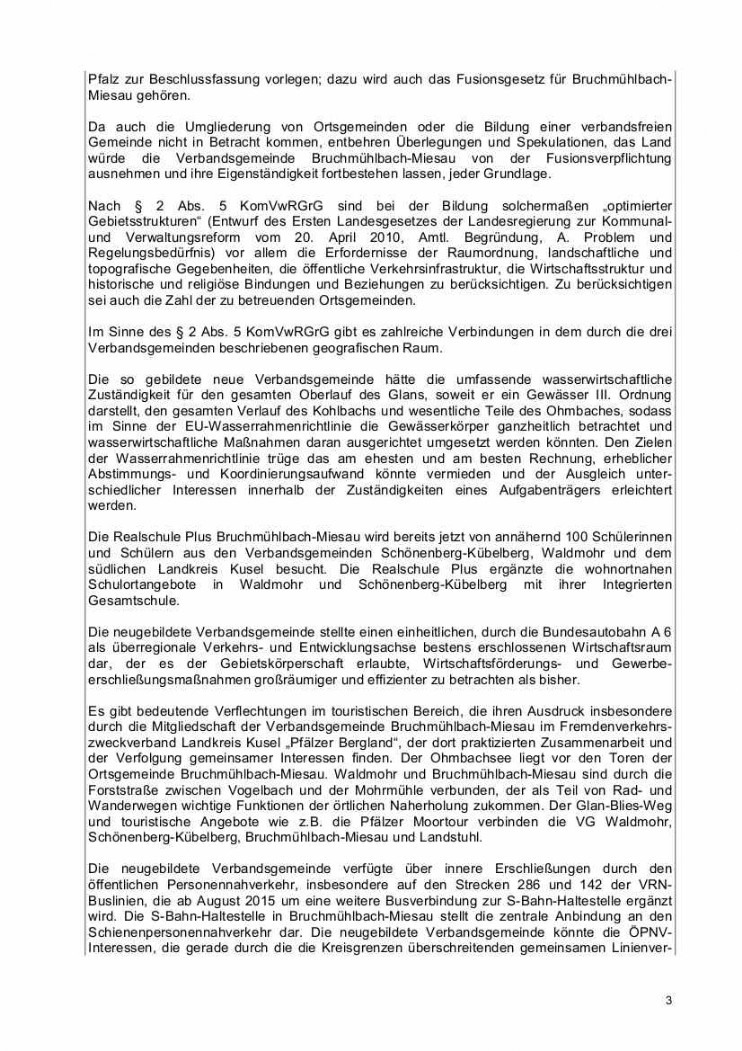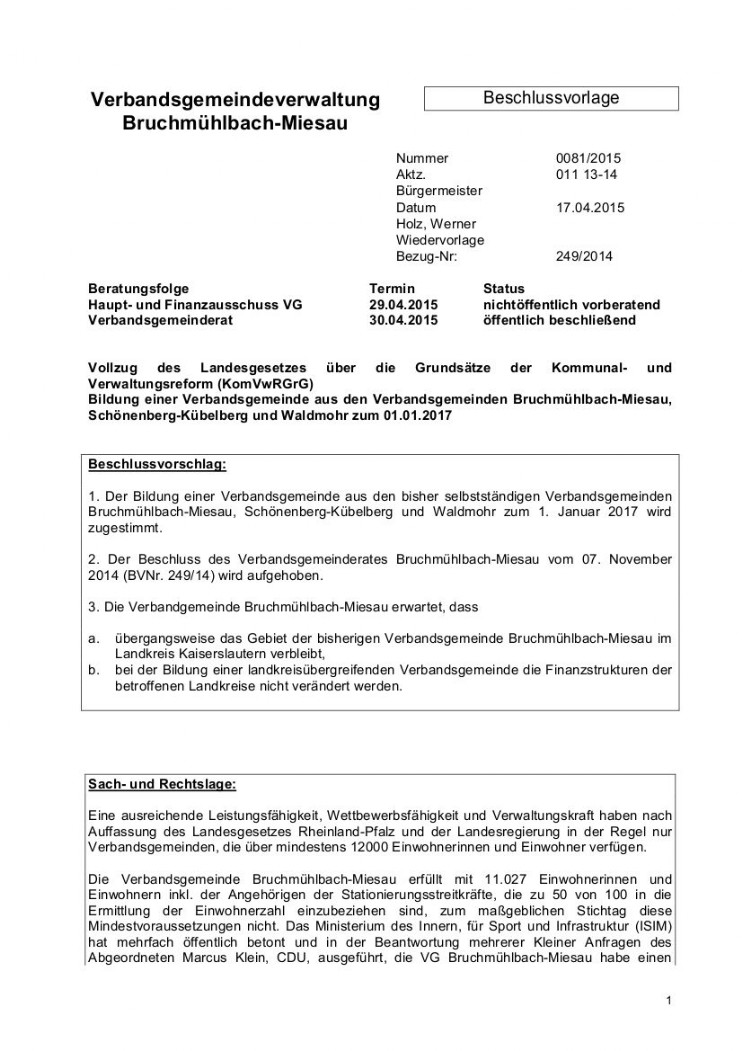 Beschlussvorlage zum Vollzug des Landesgesetzes über die Grundsätze der Kommunal- und Verwaltungsreform (KomVwRGrG) für die Sitzung des Verbandsgemeinderates Bruchmühlbach-Miesau am 30.04.2015.
