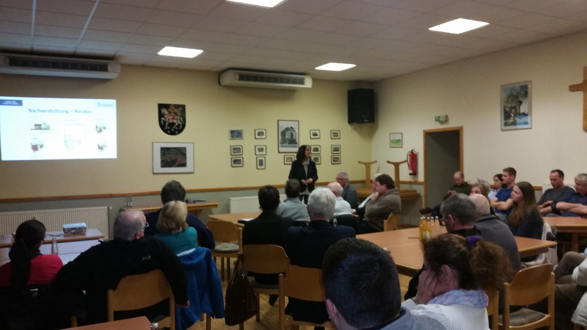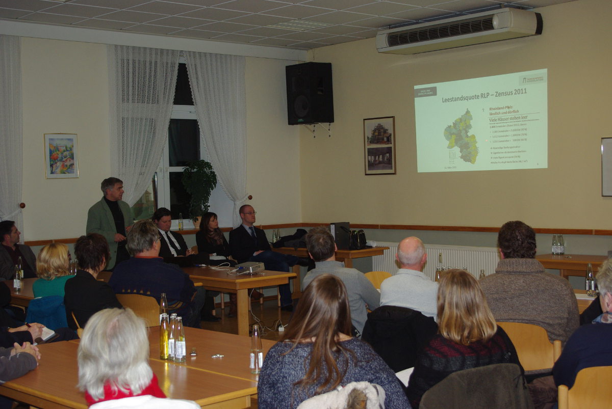 Nach einer kurzen Einführung durch Barbara Schommer, aus welchen Gründen es zu diesem einmaligen Projekt gekommen ist, startete Prof. Dr. Karl Ziegler die Vorstellung des Projektes. Er stellte anhand von Zahlen des Zensus 2011 dar, wie dramatisch sich die Bevölkerung in Martinshöhe bis zum Jahr 2030 verringern wird und erläuterte die Notwendigkeit der innerörtlichen Baulandentwicklung und der Aktivierung von leer-und untergenutzten Gebäuden und Anwesen.