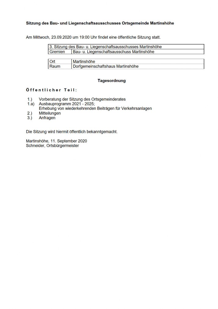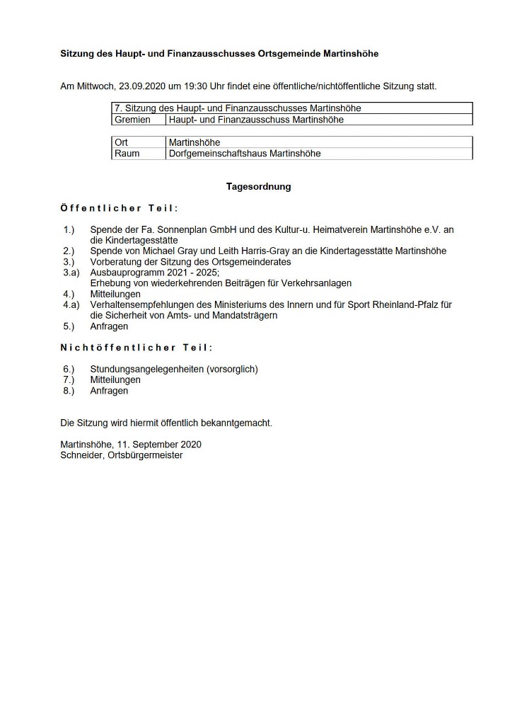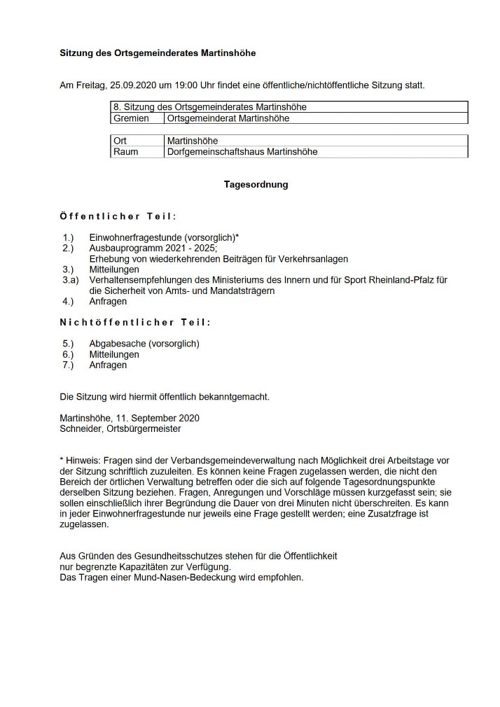 Nächste öffentliche Sitzungen Ortsgemeinderat Martinshöhe: