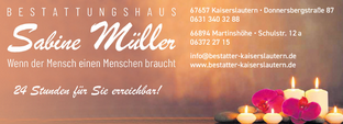 Bestattungen Sabine Müller | Schulstr. 12a | Tel.: 06372 / 2715 martinshoehe(at)bestatter-kaiserslautern.de HP: |